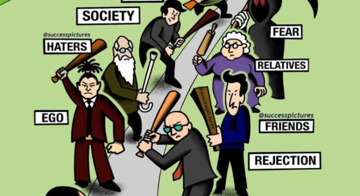 Above, the word “GOALS” floats like a beacon—red arrow pointing upward, as if to say: this is where you’re meant to go. But the path is not clear. It’s littered with figures, each one a caricature of resistance. “EGO” with its inflated chest. “HATERS” wielding bats. “SOCIETY” cloaked in judgment. “GUILT” dragging chains. “DOUBT” whispering poison. “FEAR” with its scythe. “RELATIVES” and “FRIENDS” with their well-meaning sabotage. “REJECTION” standing tall. “PESSIMISTS” crouched in the shadows.