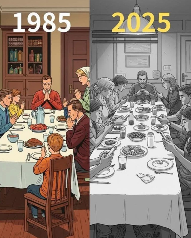 On the left, 1985: color, warmth, clasped hands, bowed heads. A family gathered not just around food, but around each other. The table is more than a surface—it’s a sanctuary. A place where stories are passed like salt shakers, where silence is sacred, and prayer is a choreography of belonging.