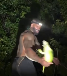 And the iguana? It’s slower. More ancient. Less volatile. Its presence is not a threat but a question: What does it mean to carry stillness in the midst of chaos? The person holding it is not wrestling—it’s a gentle grip. A moment of mutual pause. The jungle watches. The leaves lean in. The headlamp flickers like a heartbeat.