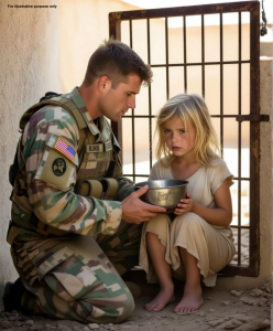 There is tenderness in the soldier’s posture. He is not towering over the girl. He is not commanding her. He is kneeling, lowering himself to her level, offering something with open hands. But there is also the weight of the uniform, the history it carries, the systems it represents. Compassion wrapped in camouflage.