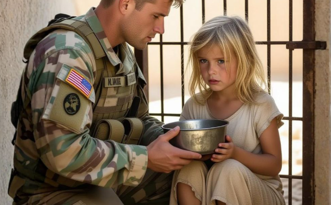 In the dust-thick silence of a sunburned afternoon, a soldier kneels. His uniform, patterned in camouflage, is meant to dissolve him into the landscape—but here, he is unmistakably visible. Not because of the flag stitched to his arm or the name tag that reads “M. White,” but because of the way he holds a metal bowl. Not like a weapon. Not like a tool. Like an offering.
