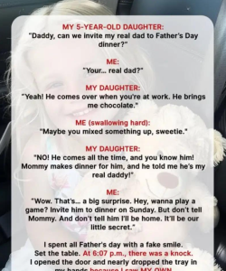 “You’re my daddy,” she said softly, “but Mommy said I have another dad. My real one.”