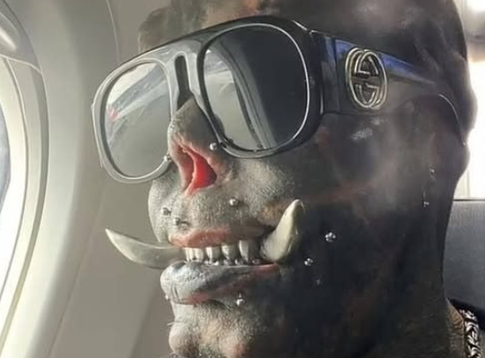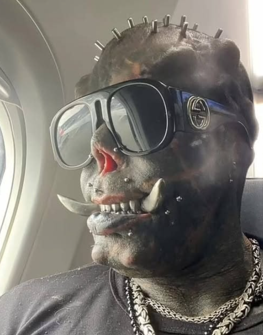 Today, his appearance is almost unrecognizable from his earlier years. His face is covered in dark tattoos, giving him a sinister, mask-like look. His eyes are completely black due to a risky procedure called scleral tattooing, where ink is injected into the whites of the eyes. He has also split his tongue, sharpened his teeth, and implanted horn-like bumps beneath his forehead skin, further enhancing his devilish look.