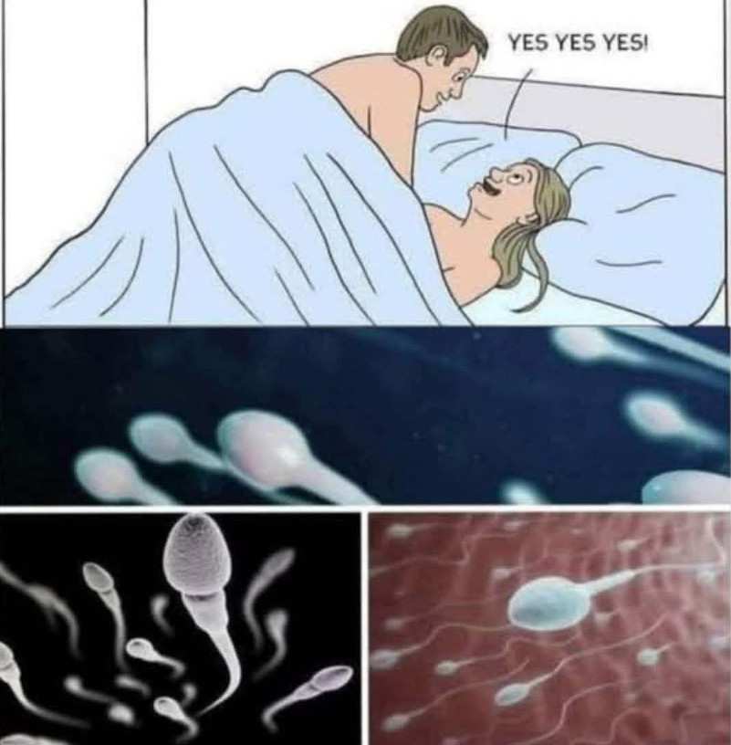 Another sperm bumped into him, gasping, “Bro, she said YES three times—this is DEFINITELY happening!”