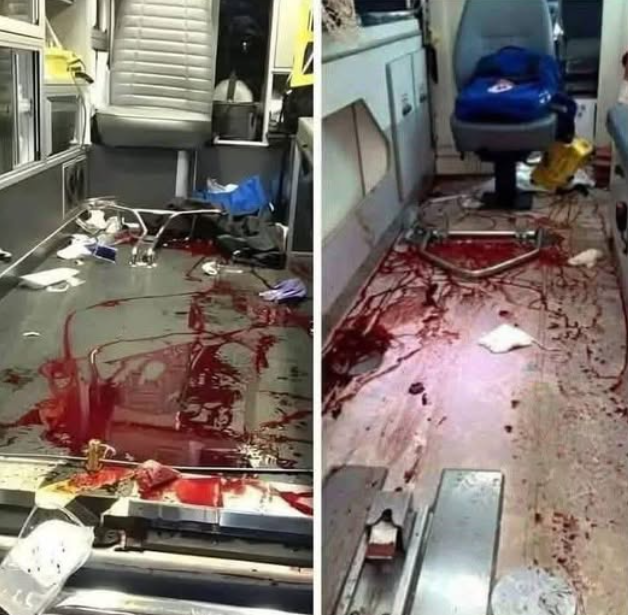 Inside the ambulance, the floor was slick with drying blood in deep red swirls. Gauze soaked and discarded lay crumpled near the base cabinets. Gloves, wrappers, and broken medical seals were scattered everywhere. The stretcher rails were crimson, the straps stiff from coagulation. Even the walls bore streaks from the chaos of the resuscitation attempt.