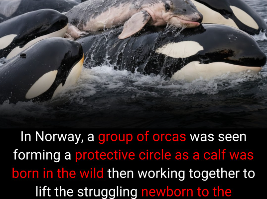 The image before us captures a moment that feels almost mythic. Dark waters churn beneath massive black-and-white bodies. Orcas—among the ocean’s most intelligent and socially complex beings—surround a fragile, pale newborn struggling at the surface. There is tension in the water, urgency in their movement, and something profoundly emotional in the way these giants appear to cradle life itself. Whether witnessed firsthand or through a single frozen frame, the scene stops us. It demands our attention.