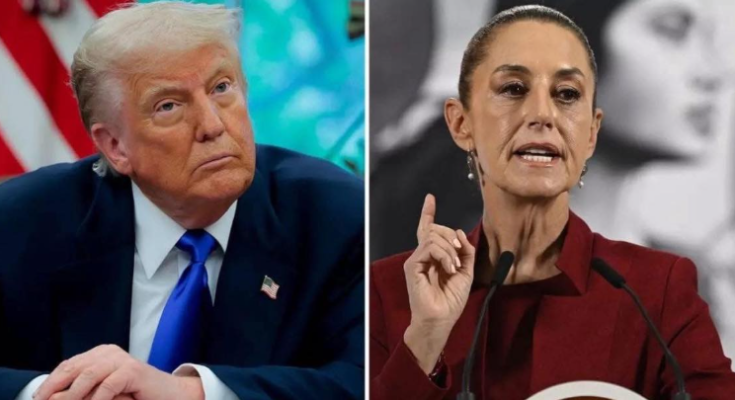 The image shows two political figures standing in very different moments of leadership — yet connected by the same global stage. On the left, a former U.S. president sits with his hands folded, face set in a familiar expression of calculation and defiance. On the right, Mexico’s president stands at a podium, finger raised, mid-speech, projecting resolve and command.