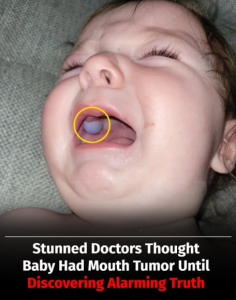 A tiny baby, barely old enough to hold their head up, lay crying with a strange blue-purple lump inside their mouth. The mass sat near the gum and tongue, smooth and rounded, like a marble hidden where it didn’t belong. Nurses froze. Doctors leaned in. Parents panicked.