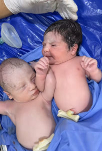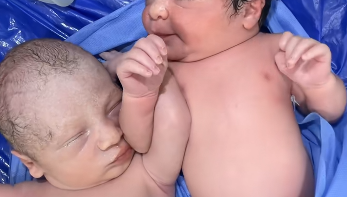 What makes this moment especially powerful is that it is shared. These are not just two newborns; they are twins, arriving together into the world they have already experienced side by side for months. Before this moment, their existence was defined by closeness—floating together, moving together, growing together. And now, even as they enter a new environment filled with light, sound, and touch, that connection remains visible.