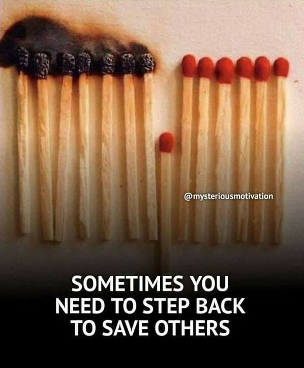 The image presents a simple yet powerful visual metaphor: a row of matches, some already burned and blackened, others still intact. One match stands slightly apart from the rest, unlit, creating a small but crucial gap. Beneath it, the message reads, “Sometimes you need to step back to save others.” At first glance, it may seem like a basic motivational quote paired with a clever arrangement. But when you sit with it, the meaning deepens into something far more profound—something that speaks to boundaries, sacrifice, self-awareness, and the quiet strength it takes to walk away.