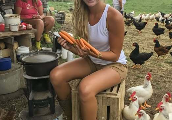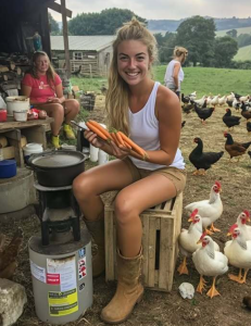 She perched on a wooden crate, a bunch of carrots in her hands, dirt still clinging to their roots. Her white tank top was streaked with soil, her khaki shorts damp from the morning harvest. But her smile was radiant, effortless, the kind that made strangers feel like old friends.